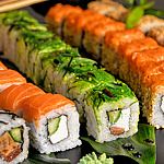 "Dino sushi" превращает прием пищи в праздник, а еду - в искусство. Суши и роллы не просто готовят. Их строят, как возводят дворцы архитекторы, их пишут, как роман или картину. Острый нож повара - вместо кисти художника. На палитре - янтарный на срезе угорь, белоснежный рис, золотая икра, зелень водорослей, лососевый ломтик. Все краски вкуса - королевские креветки, угорь, мидии, сыры, овощи. Кунжут как финальный штрих. Соус как подпись мастера. Удовольствие - видеть поваров компании "Dino sushi"