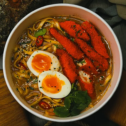 Бульон рамен, куриное филе в панировке, маринованное яйцо, сливки, острый перец, томат черри, нори, пшеничная лапша, рыбный соус, корень имбиря, чеснок, кунжут, зелень