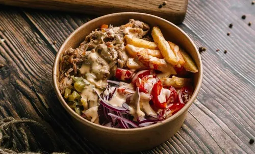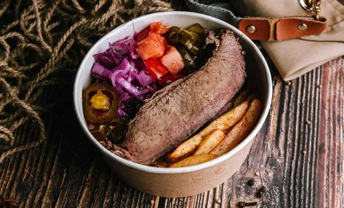 Боул с картофелем фри, говядиной BBQ, витаминным салатом, томатом, маринованным огурцом, острым перцем халапеньо и соусом гриль.