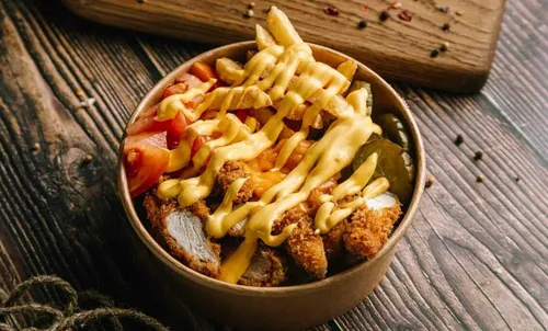 Аппетитный боул для любителей хрустящей курочки, картофеля фри, маринованных огурчиков, сыра чеддер, томатов, лука фри и сырного соуса.
