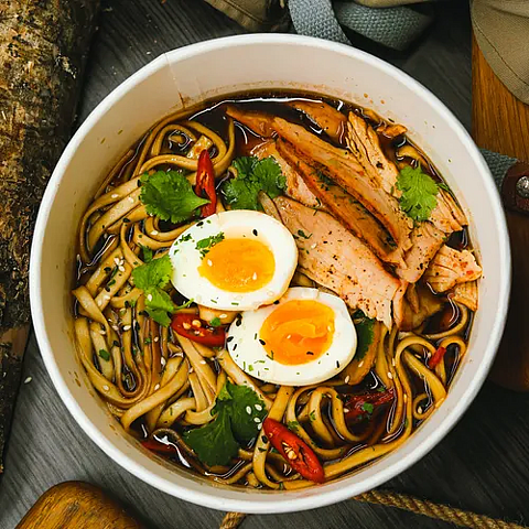 Бульон рамен, индейка филе, маринованное яйцо, острый перец, нори, пшеничная лапша, рыбный соус, корень имбиря, чеснок, кунжут, зелень