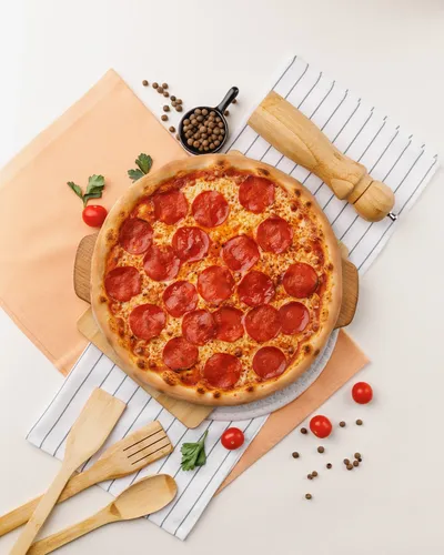 Состав: ветчина, пепперони, шампиньоны, маслины, сыр моцарелла, сливочный соус
