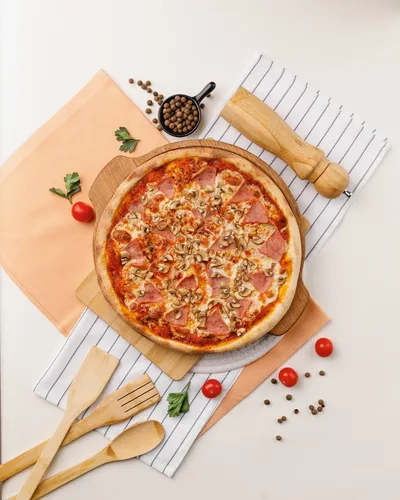 Состав: томатный соус, сыр моцарелла, ветчина, шампиньоны