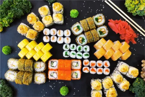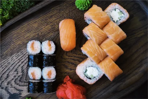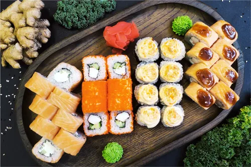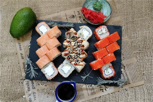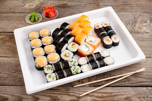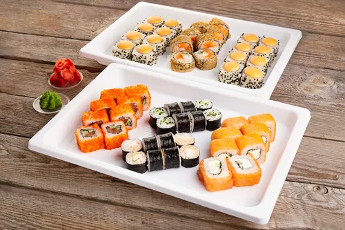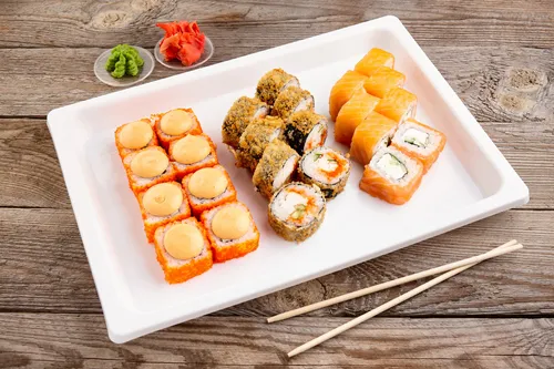 Классика: огурец, лосось, тобико, краб. Фирменные роллы: Филадельфия классик, Нежный, Бонито, Лайт, Сакура, Канада, Майами, Мексика