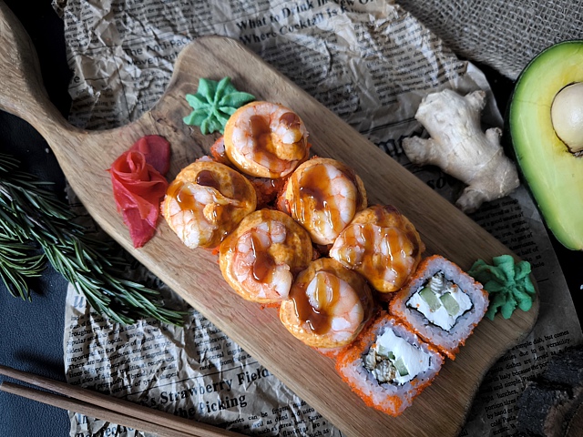 Креветка -рис, нори, креветка, масаго, огурец,майонез, кляр, сухари