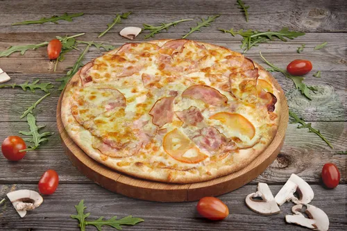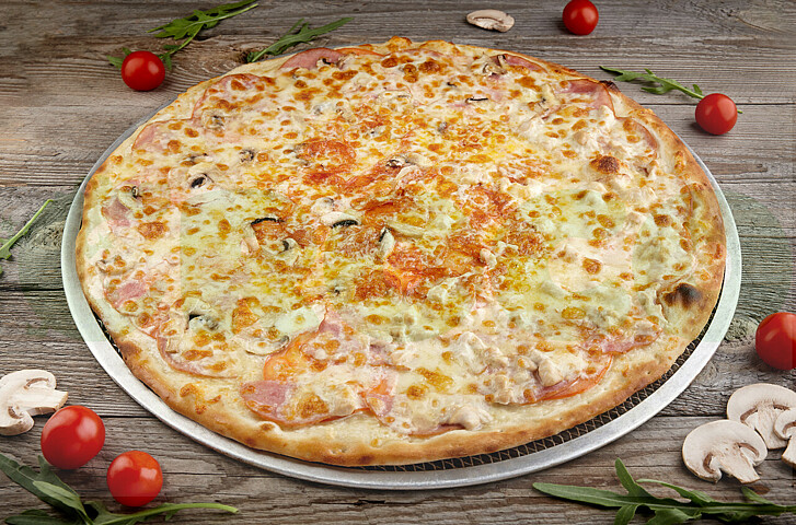 Состав: сливочный соус, ветчина, бекон, свежие томаты, фирменный микс сыров