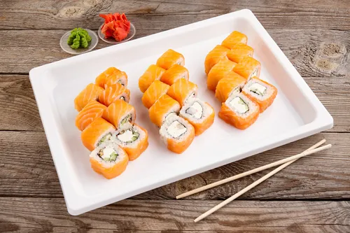 Филадельфия дабл (Рис, нори, сыр творожный, лосось, огурец)