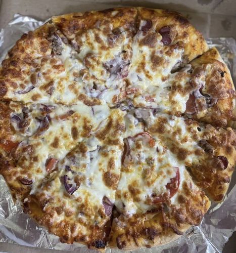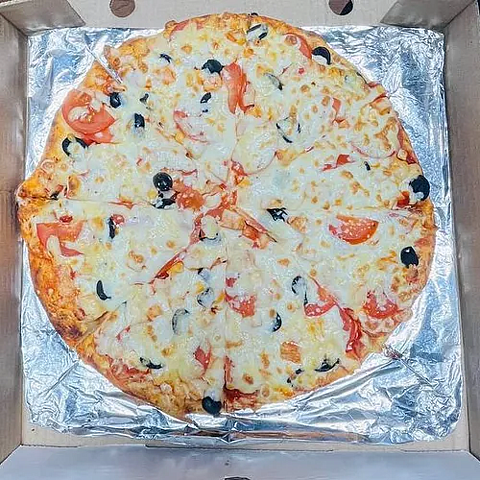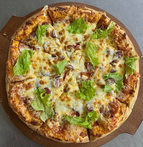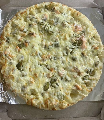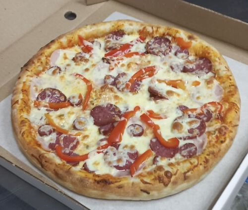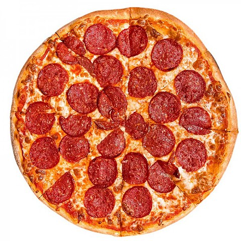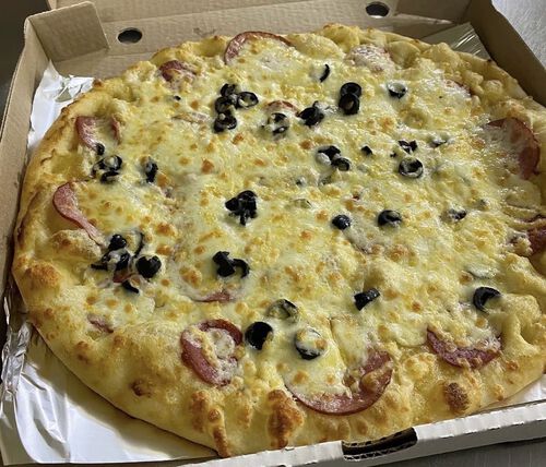 Колбаса п/к, пепперони, маслины, сыр , соус цезарь.