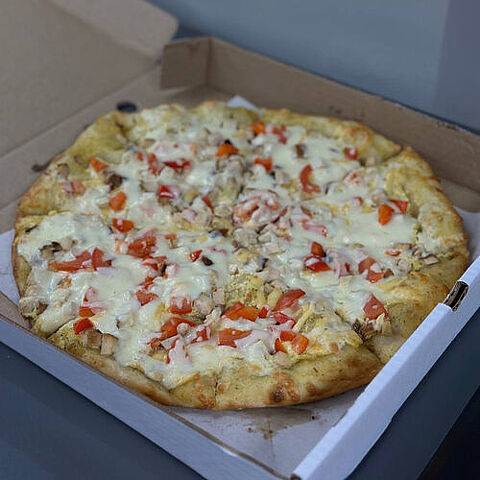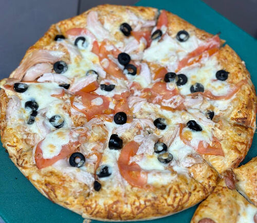 Куриное филе копченое, томаты, маслины, сыр, соус чили, соус Помодоро
