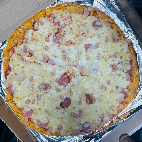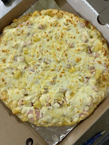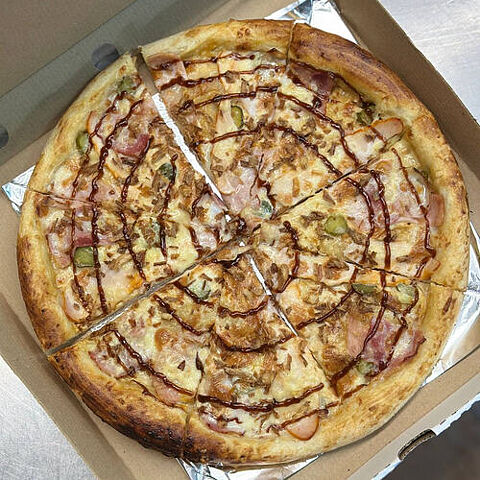 Ветчина, курица копченая, ананасы, сыр, соус цезарь.