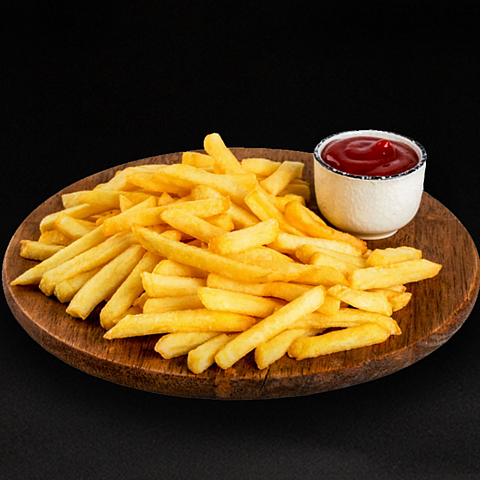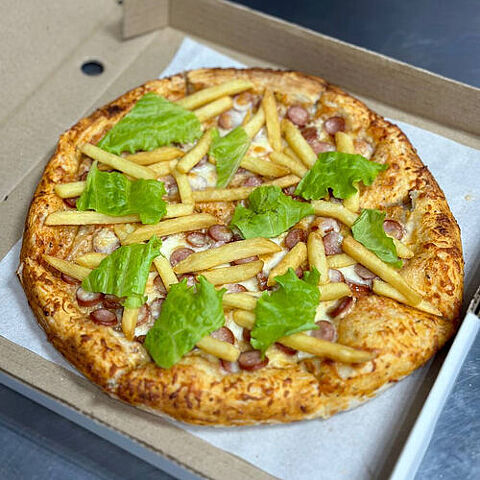 Томатный соус, сыр, картофель фри, лист салата, охотничьи колбаски
