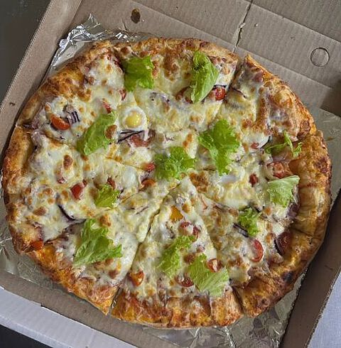 Томатный соус, бекон, черри, лук красный, сыр, яйца перепелиные.