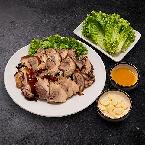 Отварная свиная рулька с добавлением традиционных приправ, добавляется с листьями салата, чесноком и кунжутным маслом (рулька 500 гр.)