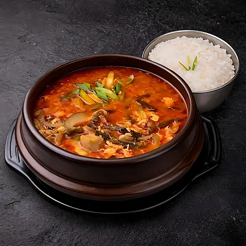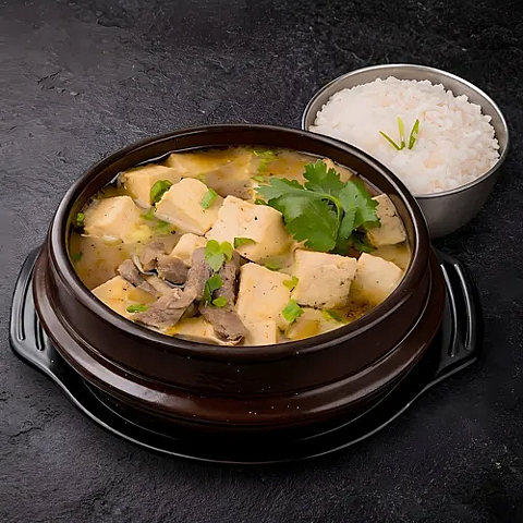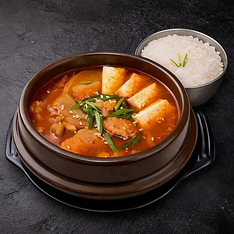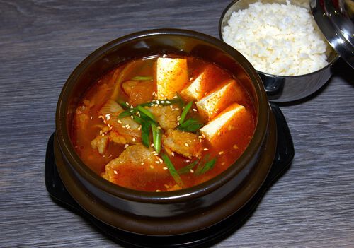 Острый суп с кимчи, свиной грудки и тофу (подается с рисом) (0,6 л.)