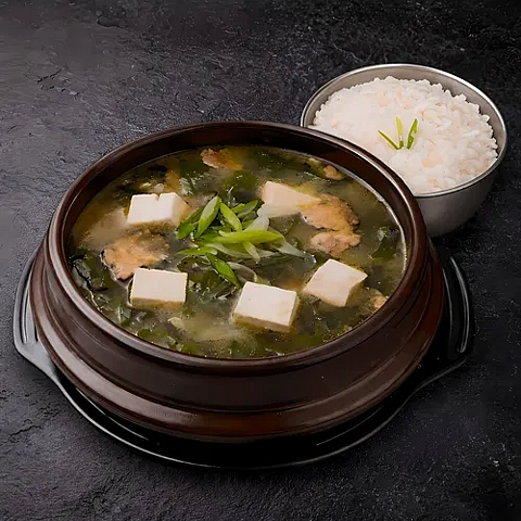 Неострый суп из соевой пасты с говядиной, водорослями вакаме и тофу (подается с рисом) (0,5 л.)
