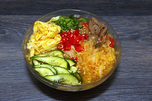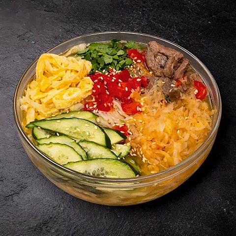 Лапша на холодном бульоне с говядиной и овощами. 1 порция (0,6 л.)