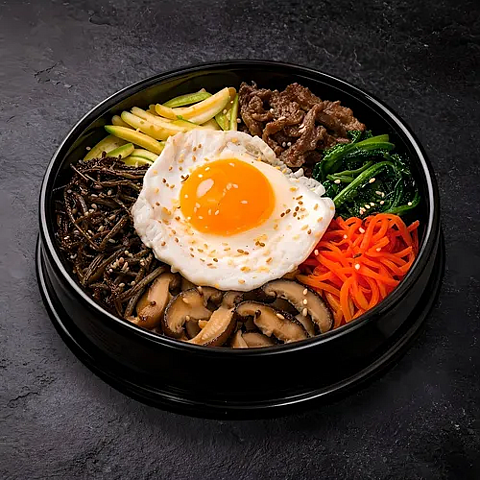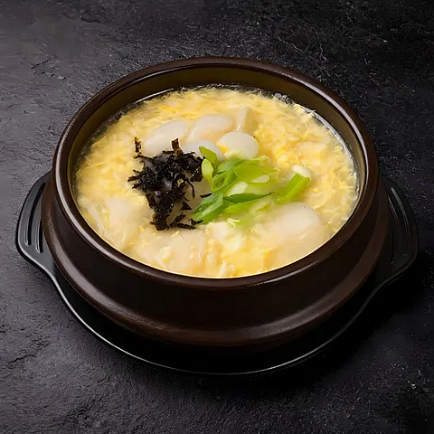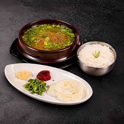 Острый суп из говядины с яйцом, папоротником, ростками сои, зеленым луком, стеклянной лапшой и грибами (подается с рисом) (0.6 л.)