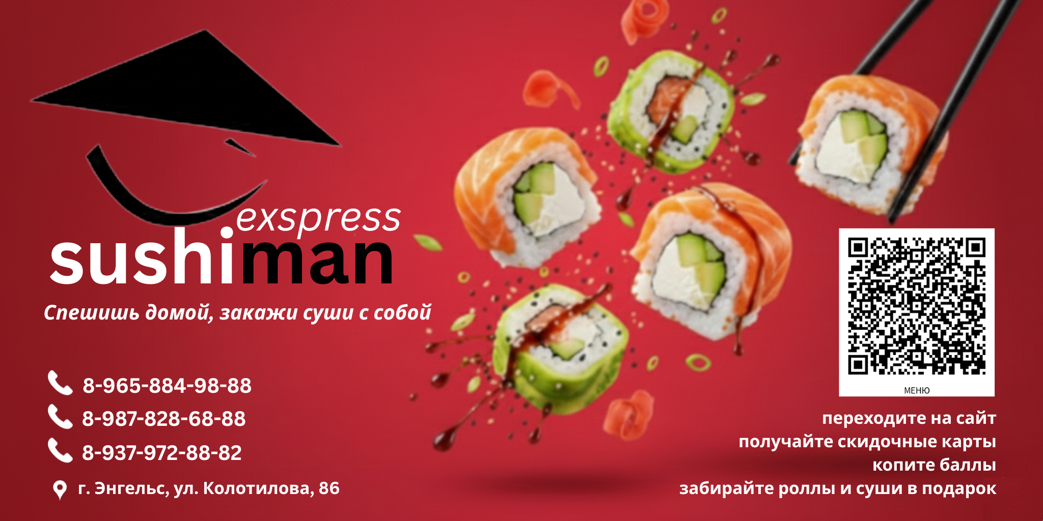 РОЛЛЫ: Калифорния с лососем, Калифорния с креветкой, Калифорния с крабом, Бонито, Сакура, Зеленая река №3, Креветка-сыр, Ролл с огурцом, Ролл с редькой, Ролл с лососем, Угорь-огурец, Лосось-сыр-огурец.