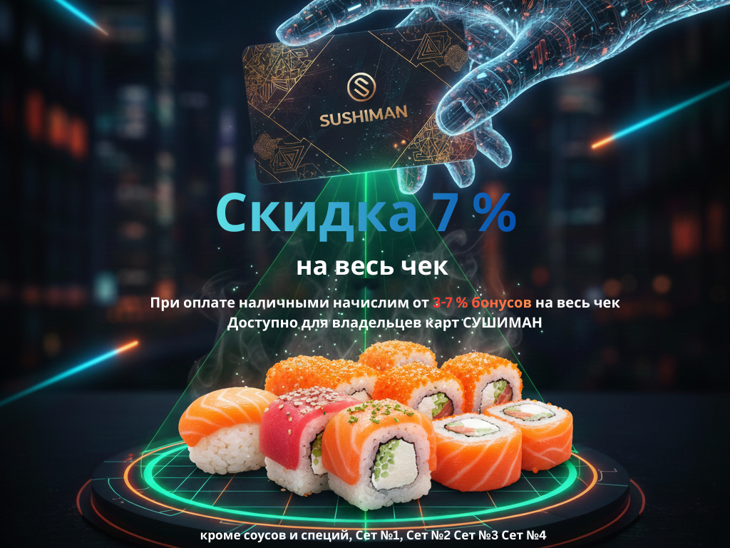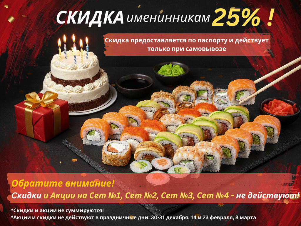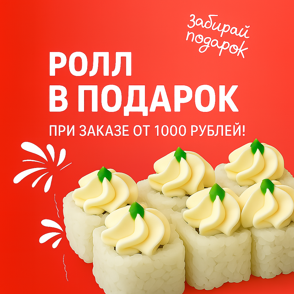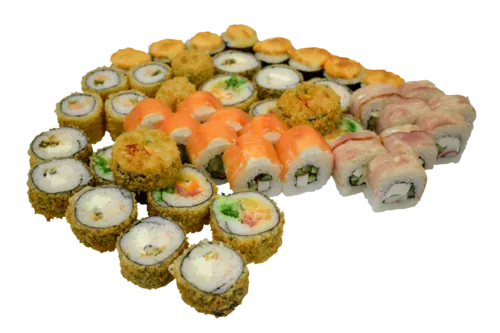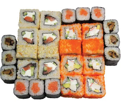 РОЛЛЫ: Канадский 0.5, Филадельфия 0.5, Сакура 0.5, Калифорния с угрем 0.5, Ролл с огурцом 1, Лосось-сыр-огурец 1, Нью-Йорк 1.