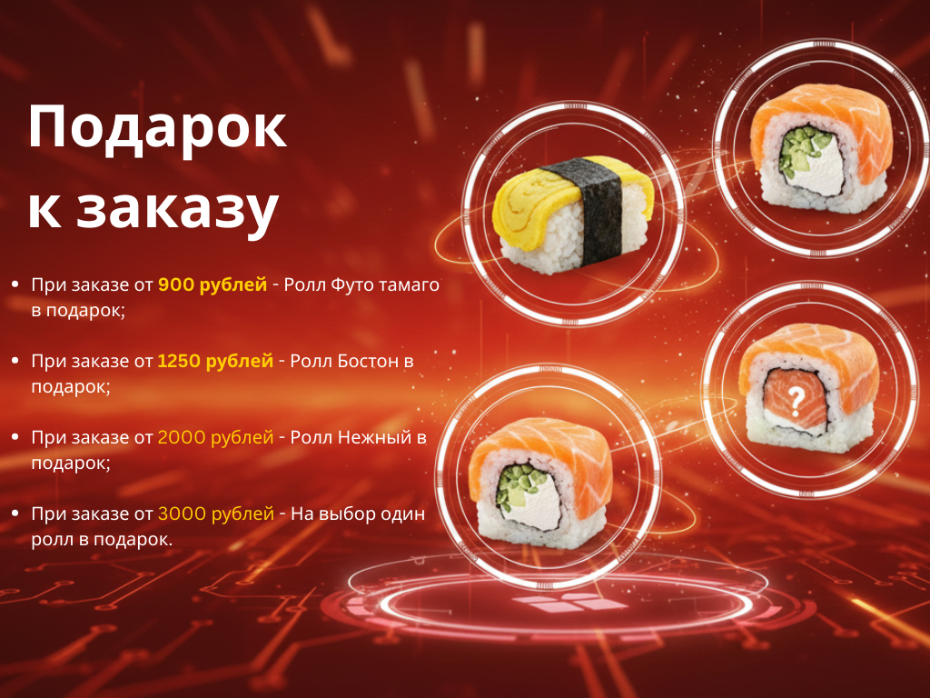 РОЛЛЫ: Нежный 1, Бонито 1, Тейшоку 1, Ролл с лососем 1, Ролл с угрем 1, Ролл с крабом 1.