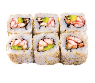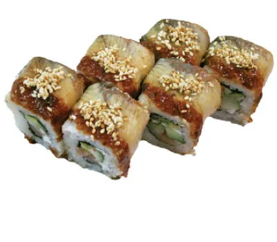 Описание: рис, нори, угорь копченый, краб, огурец, майонез, кунжут.