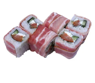 Описание: рис, нори, бекон, сыр сливочный, помидор, огурец.