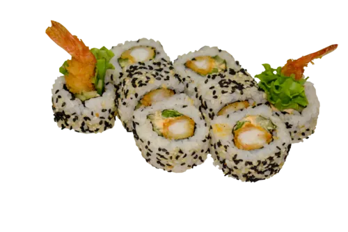 Описание: рис, креветка в кляре, спайси, огурец, лист салата, кунжут.