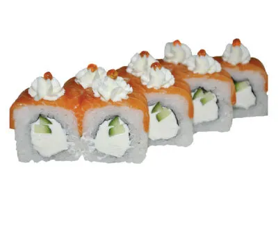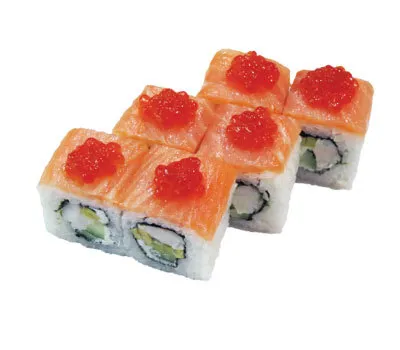 Описание: рис, нори, сыр, огурец, лосось, икра лососевая.
