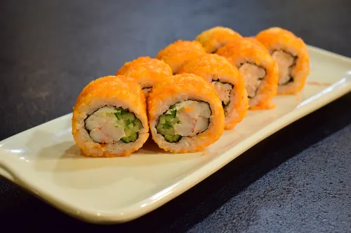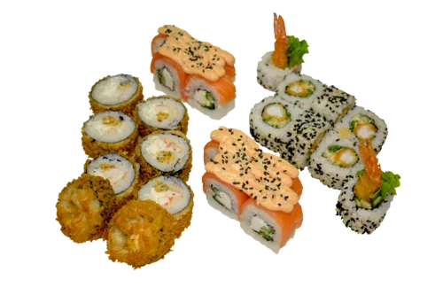 Описание: Лосось-темпура, Мидии-темпура, Калифорния с кунжутом, ролл с огурцом, лосось сыр огурец.
