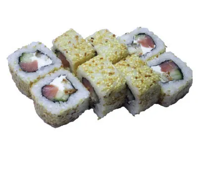Описание: рис, нори, угорь копченый, лосось, сыр сливочный, огурец, кунжут.