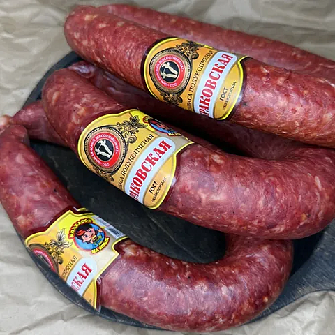 Классическая полукопченая "Краковская" колбаса, изготовленная по традиционному рецепту из охлажденной свинины и говядины с добавлением пряных специй. Продукт отличается характерным рисунком фарша с кусочками шпика, аппетитным ароматом копчения и насыщенным, слегка солоноватым вкусом. Идеально подходит для бутербродов, закусок и мясных нарезок.