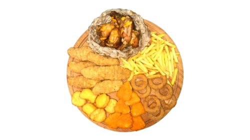 Для небольшой компании медиум самое-то! 6 стрипсов, 12 наггетсов, картофель-фри, 7 луковых колечек, 6 крылышек с соусом который вы пожелаете и 3 соуса на выбор!