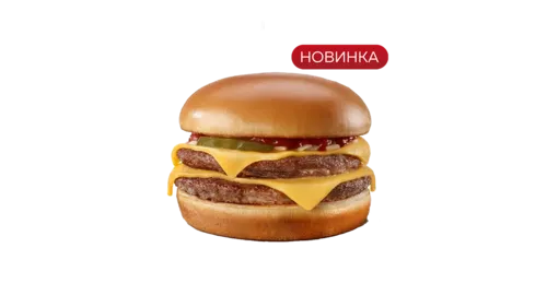 это сытное сочетание двух больших говяжьих котлет, расплавленного двух ломтиков сыра, хрустящих маринованных огурцов, горчицы и кетчупа, всё это на поджаренной булочке