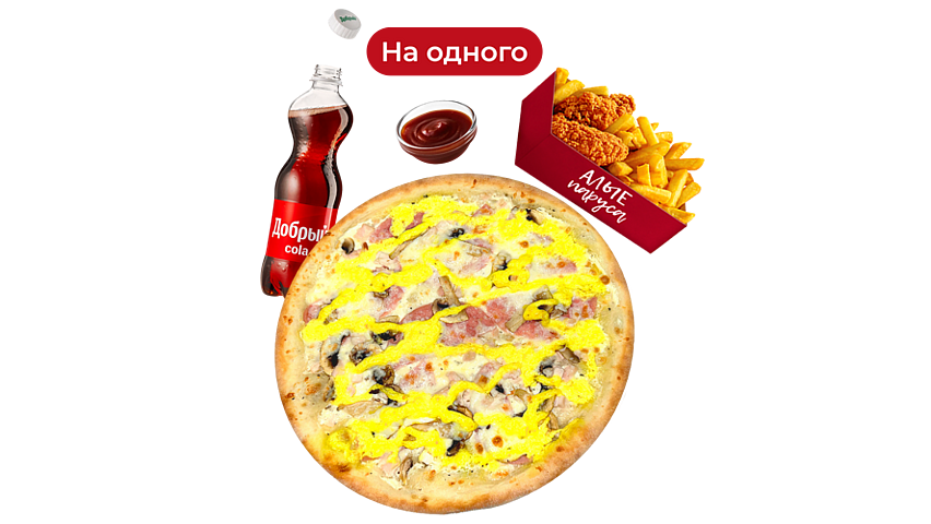 Кому-то только одному. Маленькая пицца, закуска, напиток и соус. Цена комбо зависит от выбранных продуктов и может быть увеличена