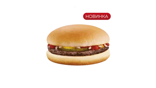 круглый, румяный и ароматный бургер. Он состоит из круглой булочки, на которой лежит сочная котлета, а сверху — ломтики соленого огурчика, заправленный соусом кетчупа и горчицы