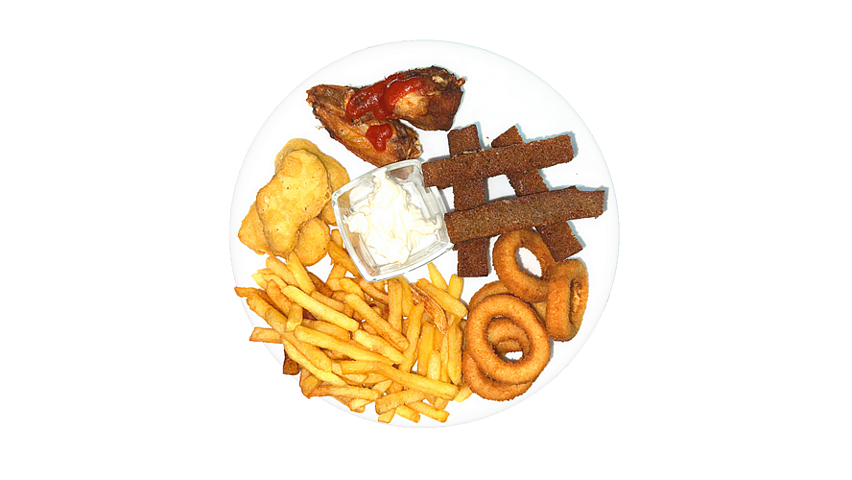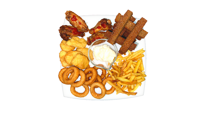 Мини пивная-тарелка на компанию из 2-х человек, состав: луковые кольца, куриные крылышки 2 шт. с соусом который вы пожелаете, гренки, картофель-фри, наггетсы - 4 шт. , соус чесночный