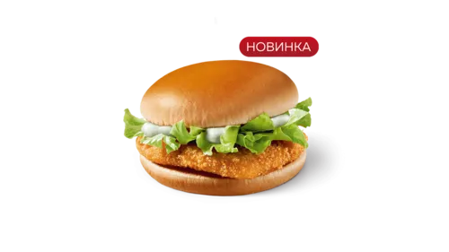 обжаренная куриная котлета из сочного мяса, панированная в сухарях, которая подаётся на булочке, заправленной свежим салатом и специальным соусом