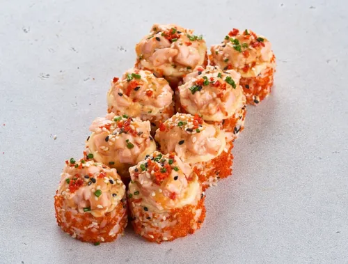 В состав входит: рис, нори, лосось, спайси соус 🌶️ и икра масаго. Осторожно, ОСТРО!