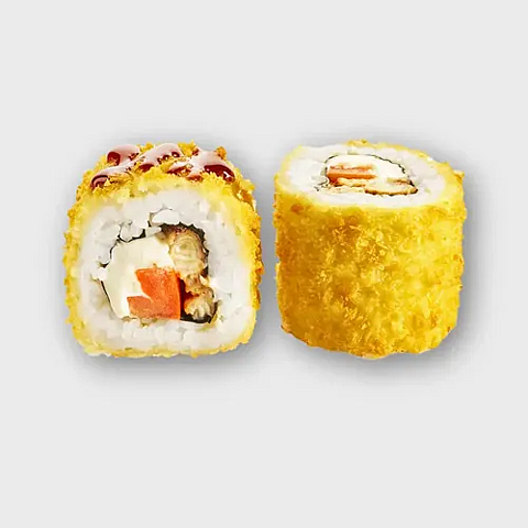 Состав : Угорь, сыр творожный , томат , сухари панко, фирменный кляр , унаги соус