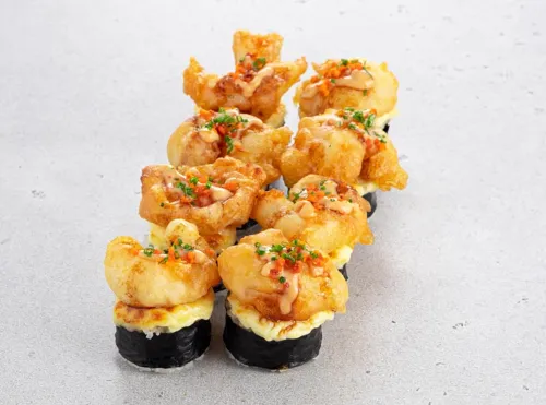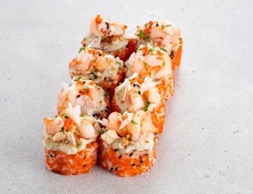 большой ролл в главной роли — удовольствие. Сливочный вкус и ореховые нотки сыра гауда , нежный сырный соус и элегантная креветка с сыром чеддер сверху — отправляем запекаться до золотистости и завершаем картину дуэтом соусов , кунжутным миксом, зеленым луком