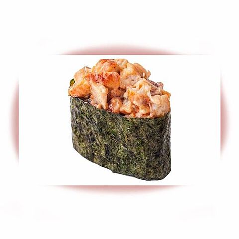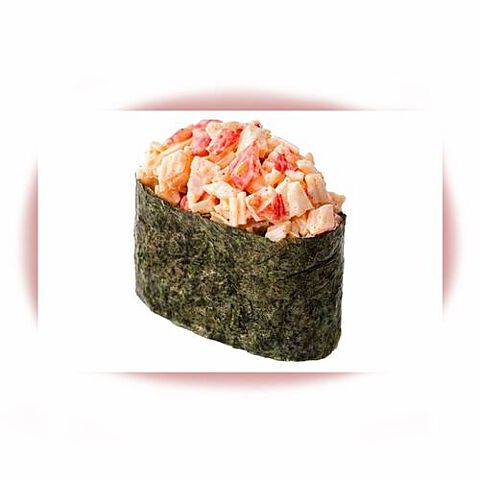 В состав входит: рис, нори, краб (сурими), соус спайси и икра масаго