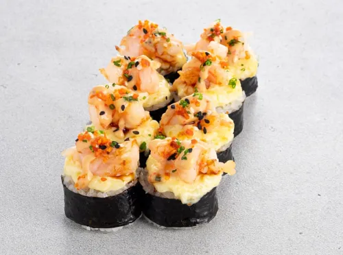 В состав входит: рис, нори, креветка, соус спайси и икра масаго
