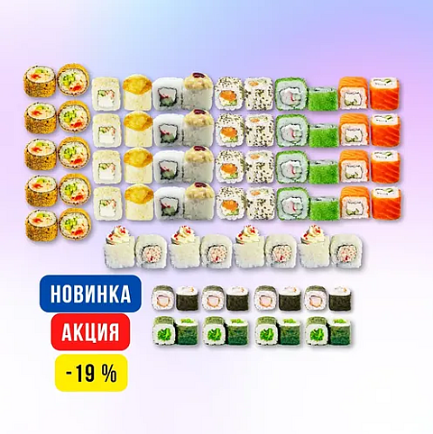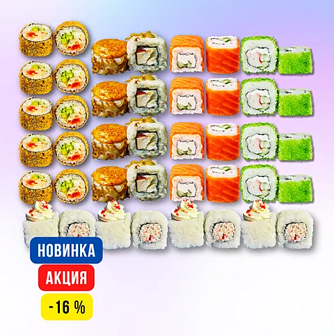 В центре внимания - эффектный ролл Янтарь в компании легкой Филадельфии и Калифорнии