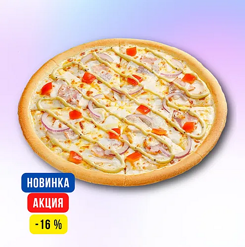 состав : курочка х/к , бекон запеченный , томат , сладкий лук, чесночек , моцарелла без ЗМЖ , соус гриль