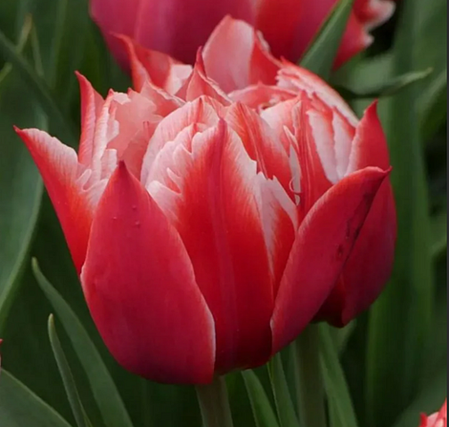 Тюльпан махровый Конкорд цветет большими цветками красно-белой расцветки уже в апреле. В полном роспуске его большие заостренные лепестки составляют бутоны, похожие на розу.