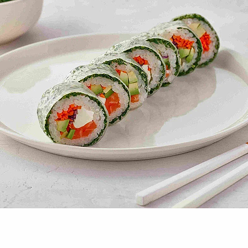 Рисовая бумага, рис, лосось, авокадо, морковь, красная капуста, руккола и творожный сыр Hochland для кремовой текстуры.