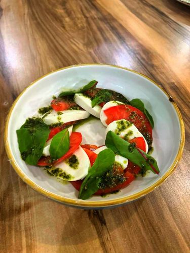 Томаты узбекские, соль, моцарелла, руккола, перец, зеленое масло, песто.