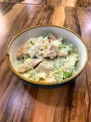 Куриное филе, салат айсберг, томаты черри, сыр пармезан, соус цезарь.