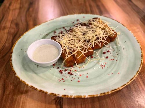 Гренки, соус блю чиз, пармезан, перец розовый, соль, кресс горох.
