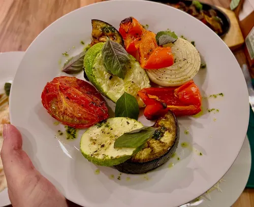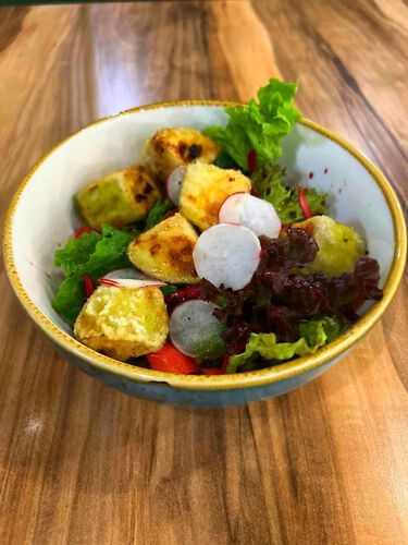 Томаты, баклажаны, узбекские, свит чили, микс салата, лук красный маринованный, редис, горох кресс, бобы соевые, кинза.